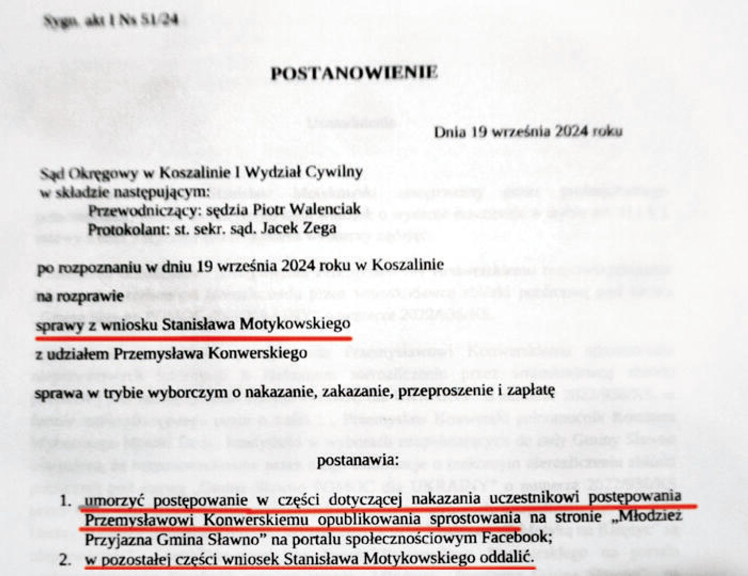 - Sąd oddalił wniosek Stanisława Motykowskiego, który twierdził, że w ramach agitacji wyborczej rozpowszechniałem o nim, jako o kandydacie na radnego Rady Gminy Sławno, nieprawdziwe informacje. Nic takiego nie miało nigdy miejsca! Sąd przyznał mi w pełni rację. Wniosek został uznany za bezzasadny. Prawda wygrała – mówi Przemysław Konwerski.