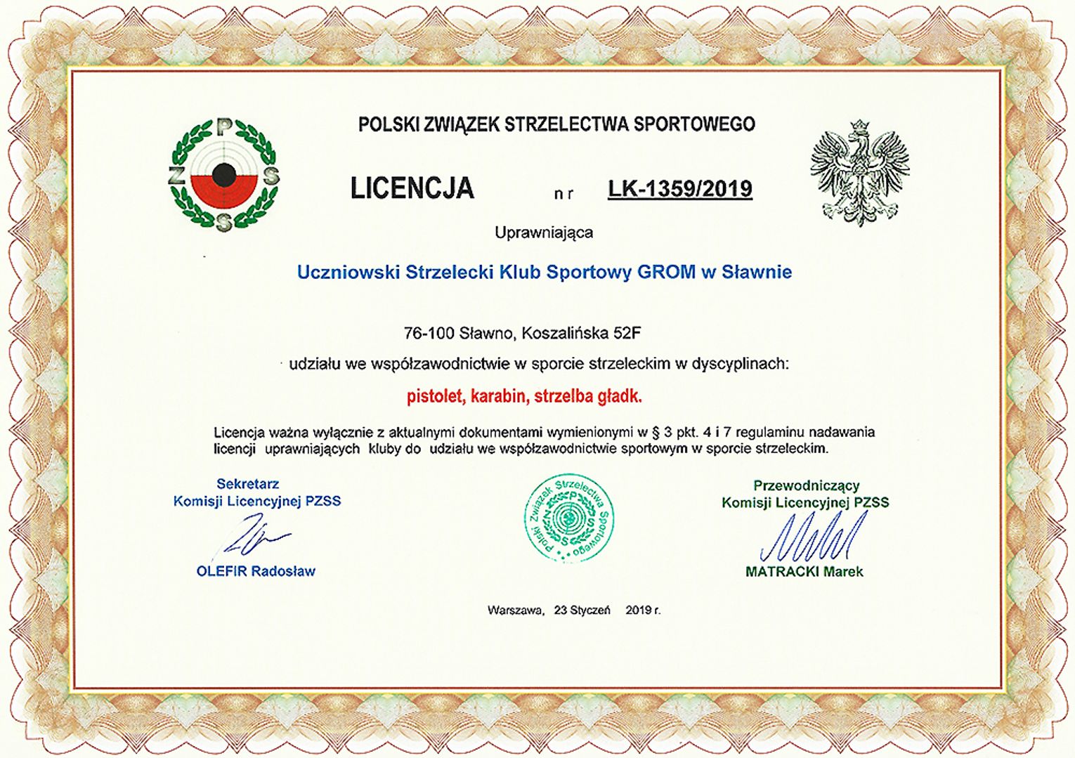 Informujemy, że Uczniowski Strzelecki Klub Sportowy GROM Sławno został członkiem Polskiego Związku Strzelectwa Sportowego otrzymując licencję nr LK-1359/2019 uprawniającą Klub do udziału we współzawodnictwie w sporcie strzeleckim w dyscyplinach: pistolet, karabin, strzelba gładkolufowa.