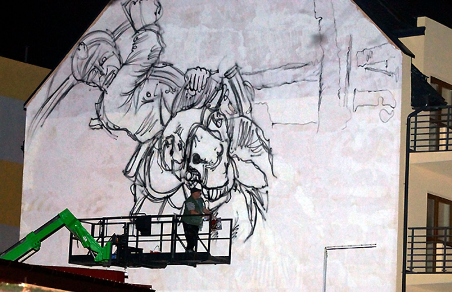 Dzieło będzie powstawało przez kilka dni. Głównym motywem jest kawalerzysta na koniu depczącym symbole zaborców. Na początek artysta "rzucił" obraz na ścianę budynku i obrysował go. Przez kolejne dni będzie (wraz z pomocnikami) nanosił kolory. Dzieło, w całej okazałości, powinno być gotowe do środy. Mural jest finansowany z prywatnych środków Andrzeja Bernala ze Sławna. Więcej w wydaniu papierowym