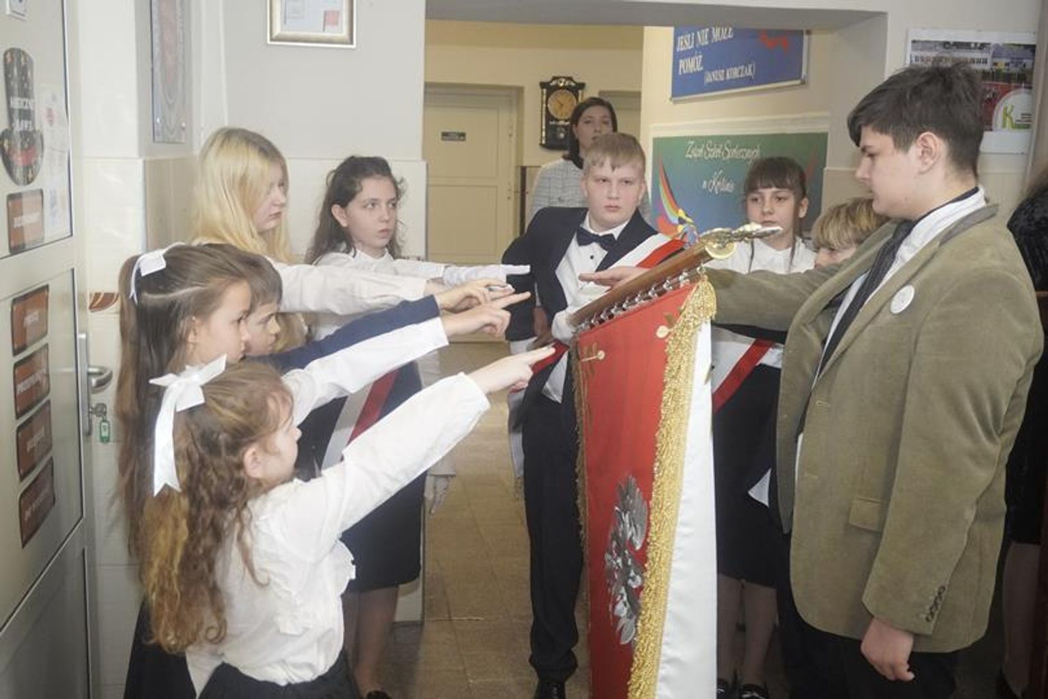 Nowy szkolny sztandar poświęcił ks. Andrzej Bagiński - proboszcz parafii w Łącku.