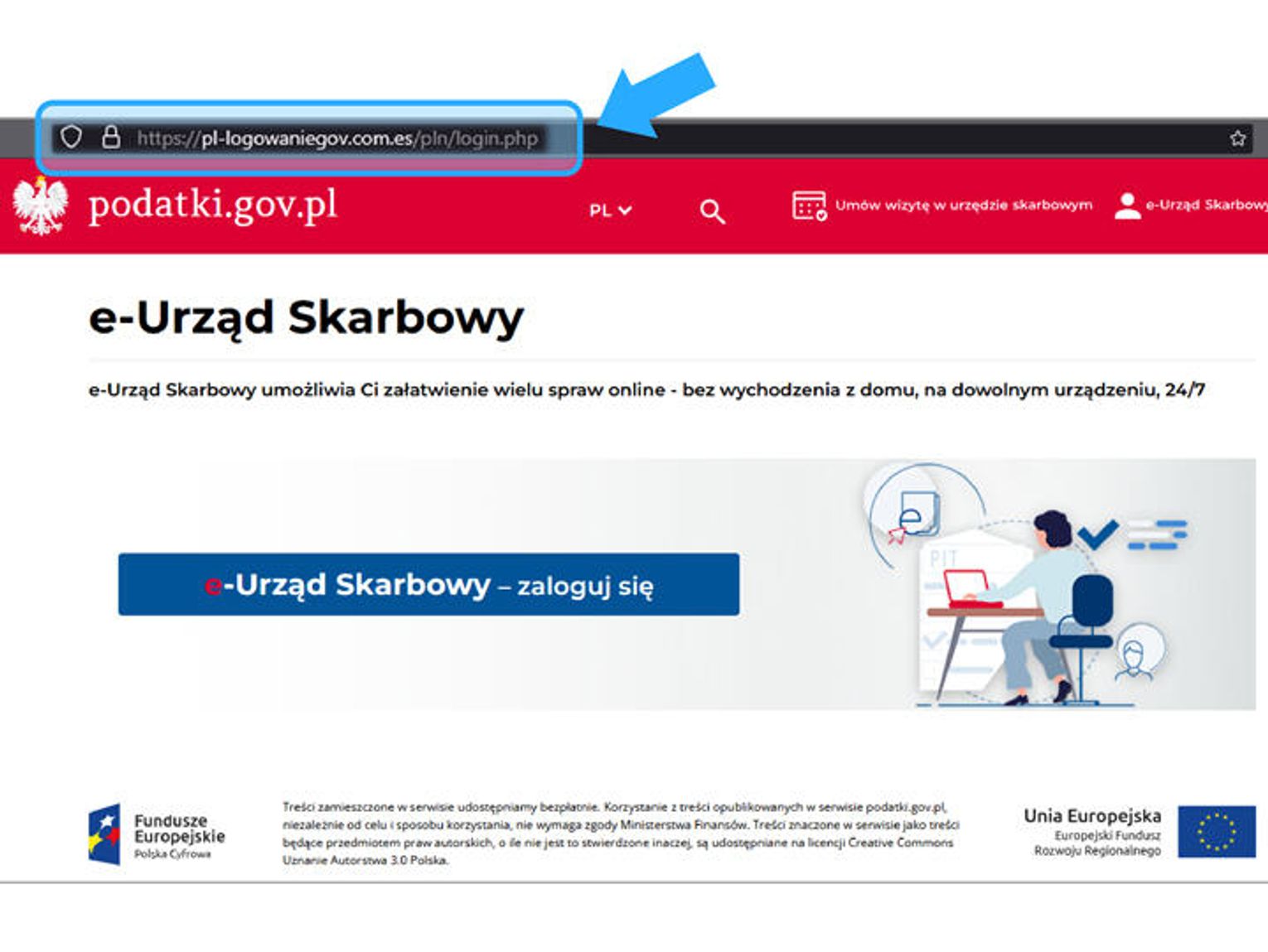 Niektóre fałszywe strony, przygotowane przez oszustów, są często podobne do oryginalnych stron resortu finansów i trudno je odróżnić. Dlatego należy zwracać szczególną uwagę na opis linku w adresie strony internetowej.