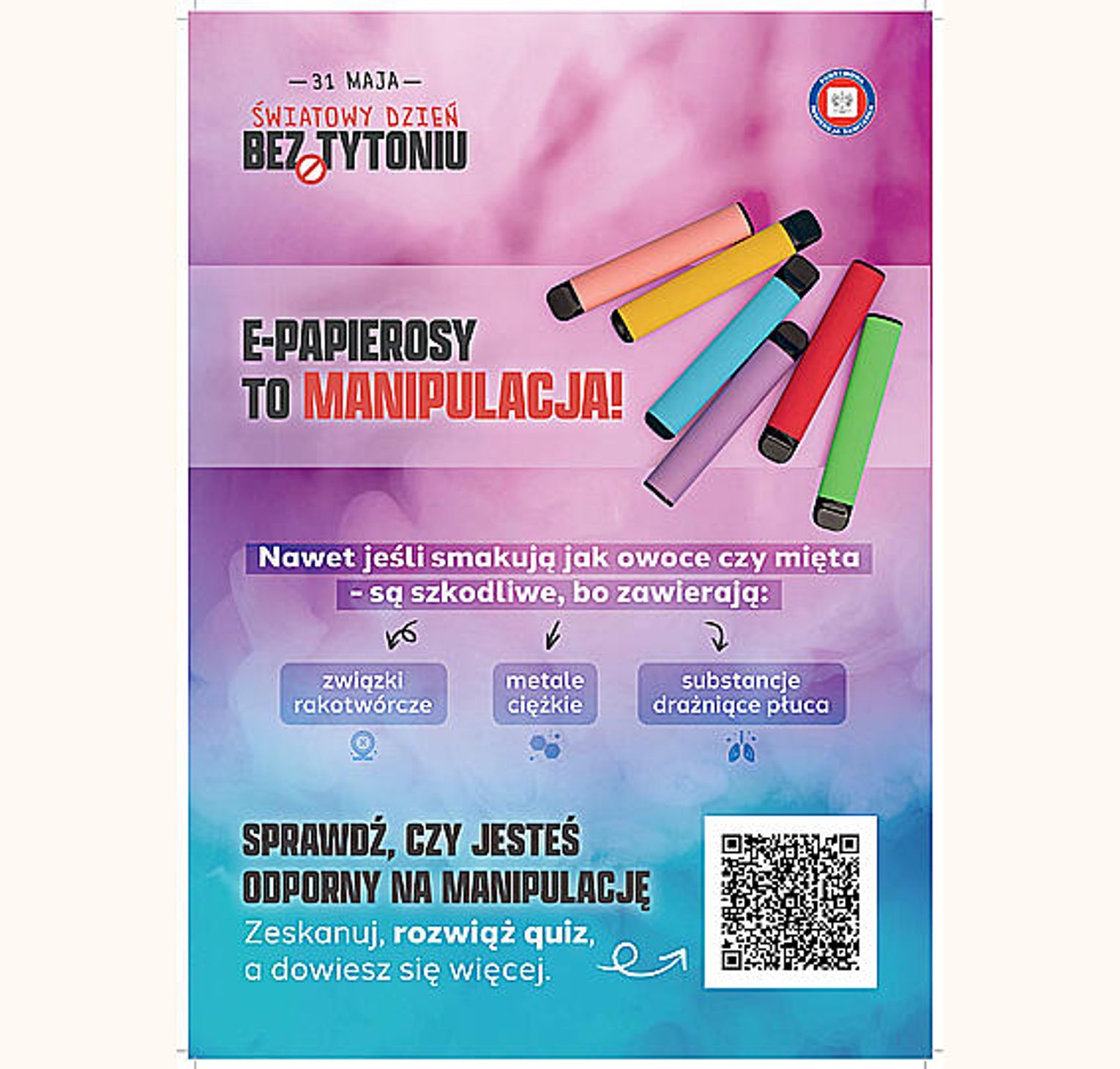 W związku z przypadającym 31.05.2025 r. Światowym Dniem bez Tytoniu, Główny Inspektorat Sanitarny rozpoczął kampanię edukacyjno-informacyjną pod hasłem: „E-papierosy to manipulacja!”. Kampania skierowana jest do dwóch głównych grup odbiorców: dorosłych (rodziców i nauczycieli) oraz uczniów klas 6–8 szkół podstawowych.