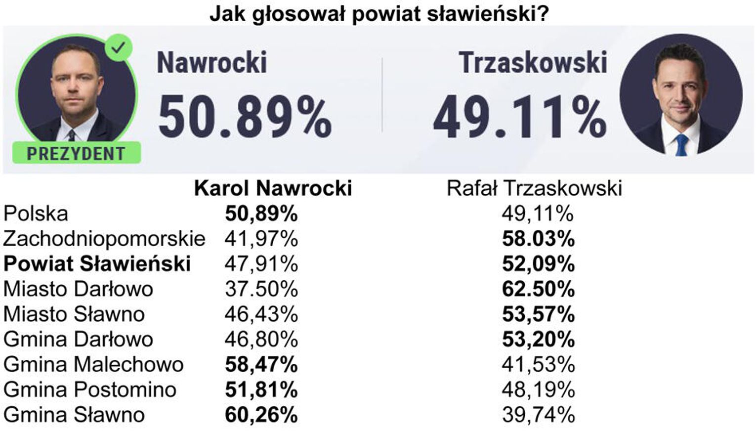 Karol Nawrocki zdobył 10 606 877 głosów (50,89%) - najwięcej w 6 województwach (małopolskim (58,87 procent), lubelskim (66,54 procent), łódzkim (53,20 procent), podkarpackim (71,02 procent), podlaskim (61,39 procent) i świętokrzyskim (63,61 procent).