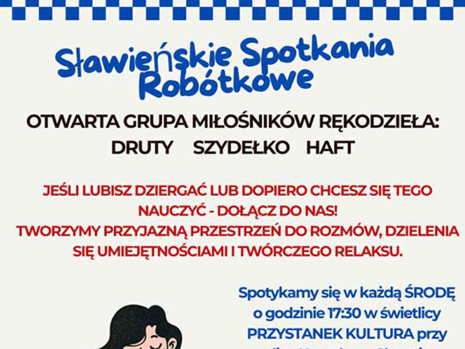 Na portalu społecznościowym można zobaczyć plakat, który zaprasza wszystkich chętnych na zajęcia z robótek ręcznych na drutach, szydełku lub nauka haftu.