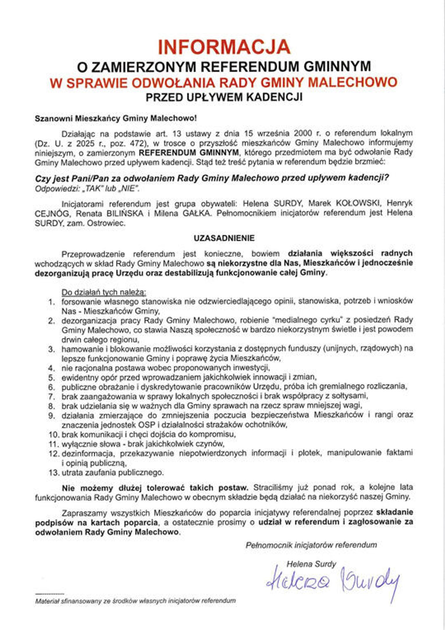 Do Biura Rady Gminy Malechowo wpłynęło pismo grupy mieszkańców gminy Malechowo domagających się zorganizowania referendum w sprawie odwołania Rady Gminy Malechowo. Pod wnioskiem, w imieniu grupy inicjatywnej (Marek Kołowski, Henryk Cejnóg, Renata Bilińska, Milena Gałka), podpisała się Helena Surdy z Ostrowca – pełnomocnik inicjatorów. Według wnioskodawców przeprowadzenie referendum jest konieczne, bo działania większości radnych wchodzących w skład Rady Gminy Malechowo są niekorzystne dla Nas, Mieszkańców jednocześnie dezorganizują pracę Urzędu oraz destabilizują funkcjonowanie całej Gminy.