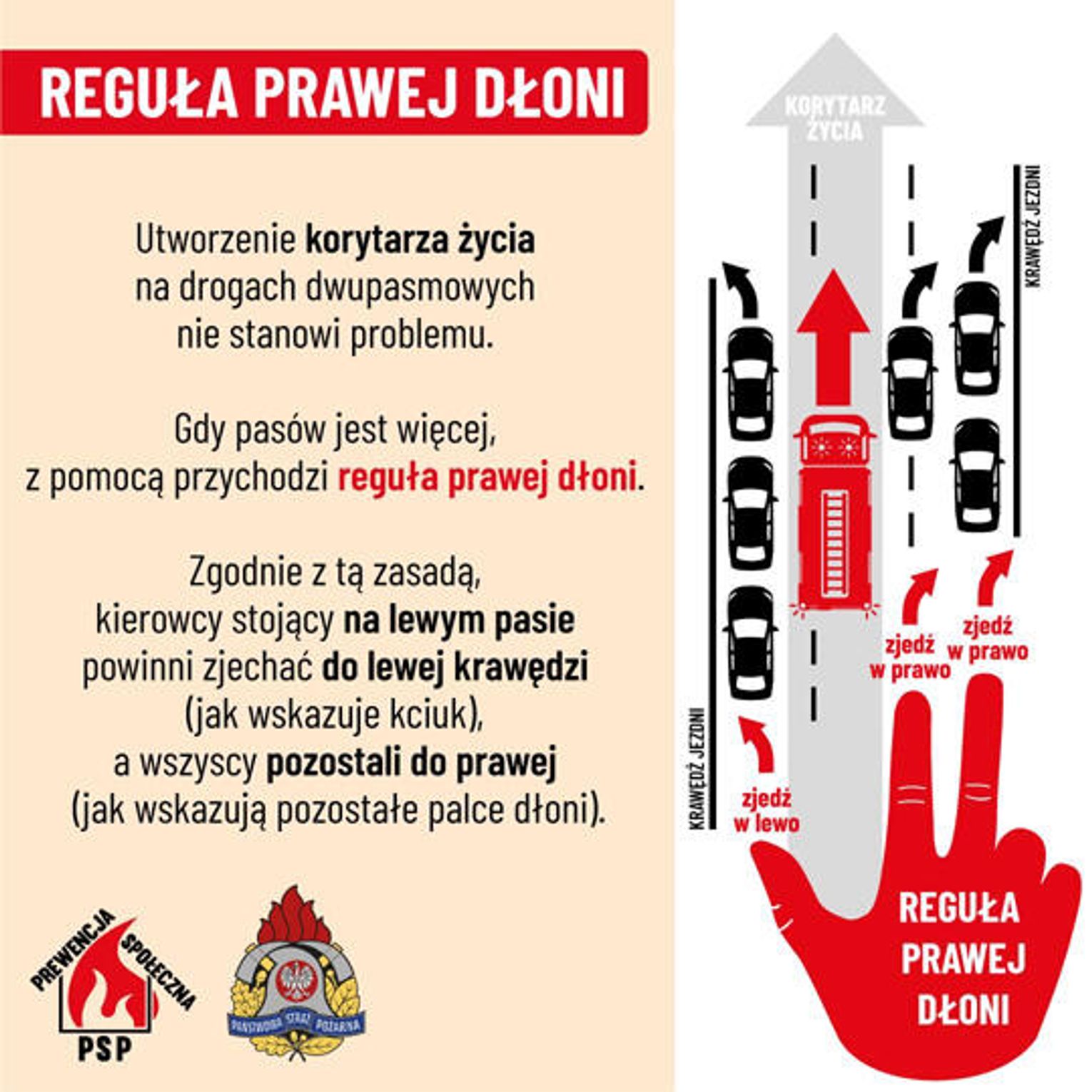 - Pamiętaj o zasadzie prawej ręki – Na drogach dwupasmowych w Polsce zasada tworzenia korytarza życia jest prosta: samochody z lewego pasa zjeżdżają w lewo, a te z prawego pasa - w prawo. Na drogach o większej ilości pasów, na lewo zjeżdżają kierowcy z lewego pasa, pozostali - na prawo, zgodnie z zasadą prawej ręki. Znajomość tych zasad i ich przestrzeganie, to podstawa bezpieczeństwa na drodze.