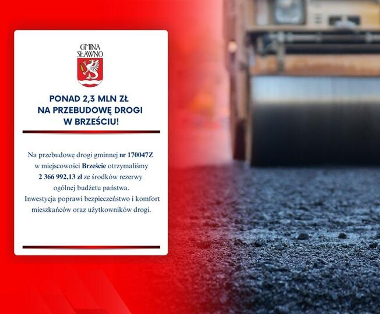 Gmina Sławno może podzielić się dobrymi wieściami. Ze środków rezerwy ogólnej budżetu państwa przeznaczono aż 2 366 992,13 zł na przebudowę gminnej drogi nr 170047Z w wiosce Brzeście.