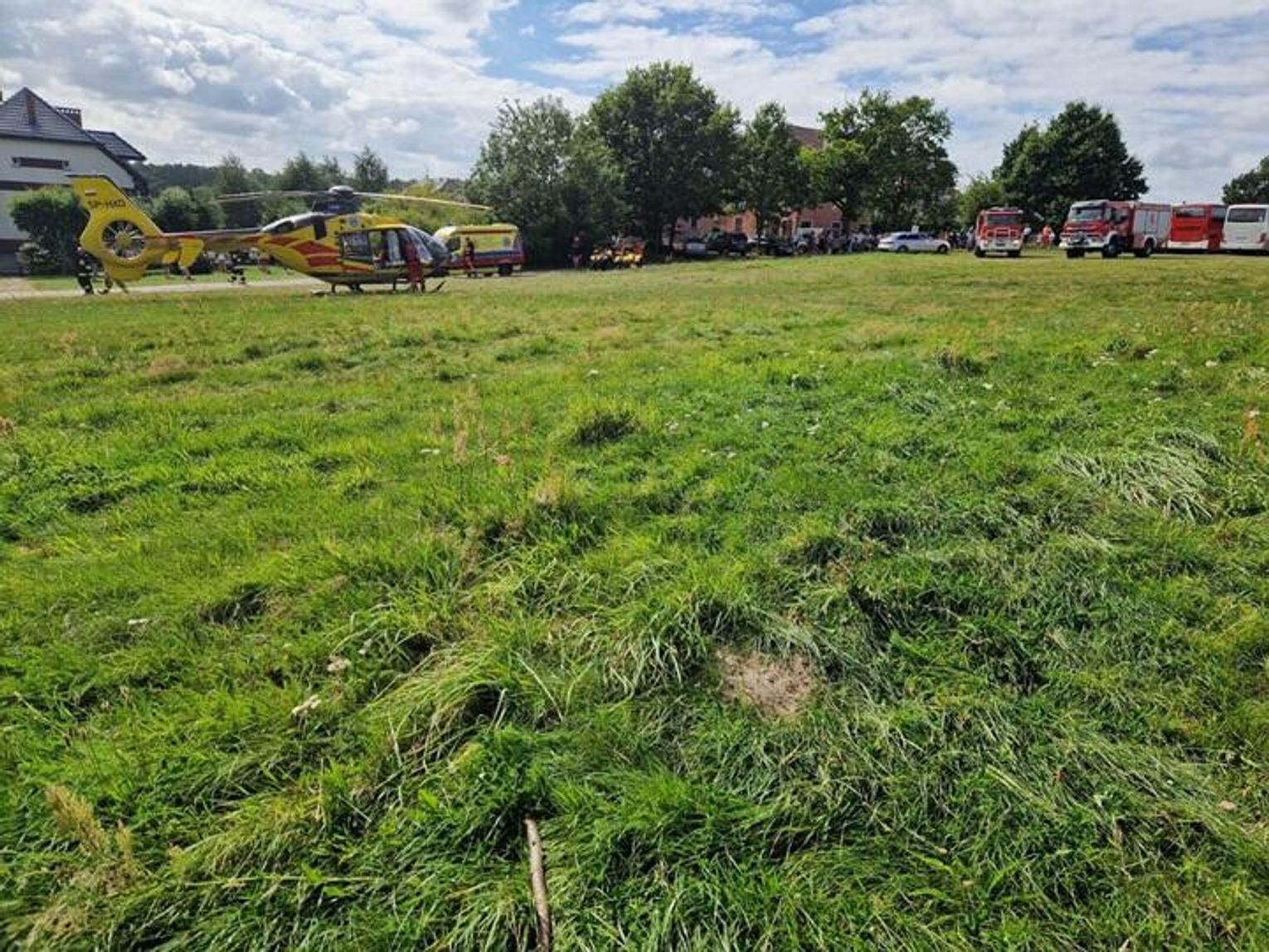 Na przystani kutrów rybackich w Jarosławcu strażacy z OSP zabezpieczali lądowanie śmigłowca LPR.