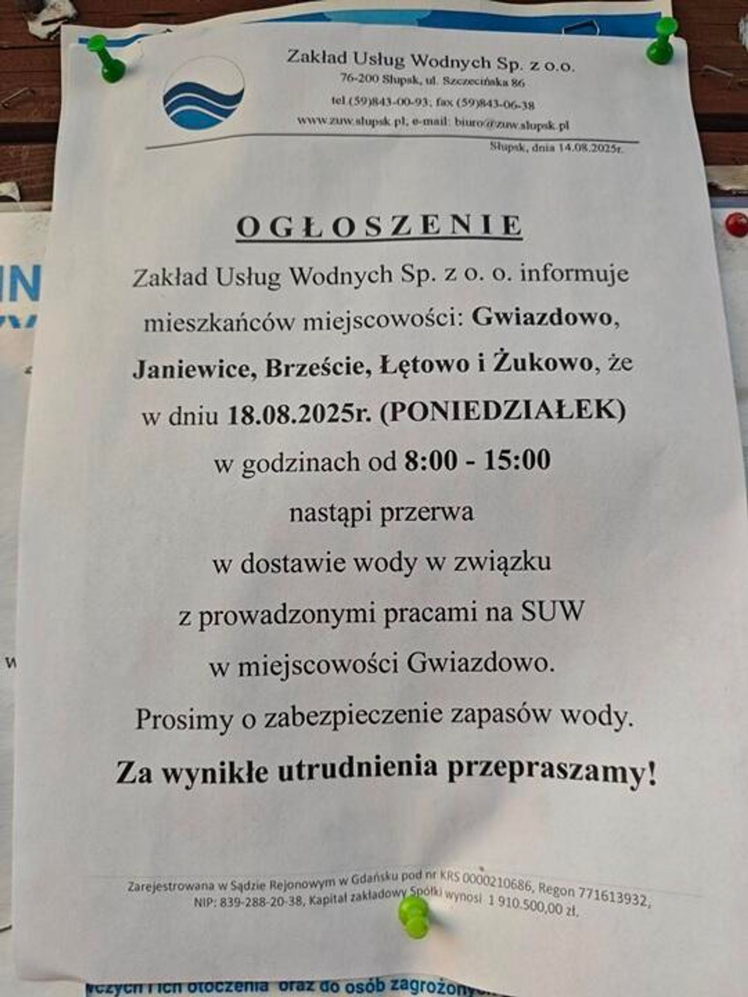 Jak informuje Zakład Usług Wodnych Sp. z o.o. w Słupsku, już jutro (18.08) od godziny 8:00 do 15:00 nastąpi przerwa w dostawie wody. Obejmie ona Gwiazdowo, Janiewice, Brzeście, Łętowo oraz Żukowo. Powodem prognozowanej przerwy mają być prace prowadzane na stacji uzdatniania wody w Gwiazdowie.