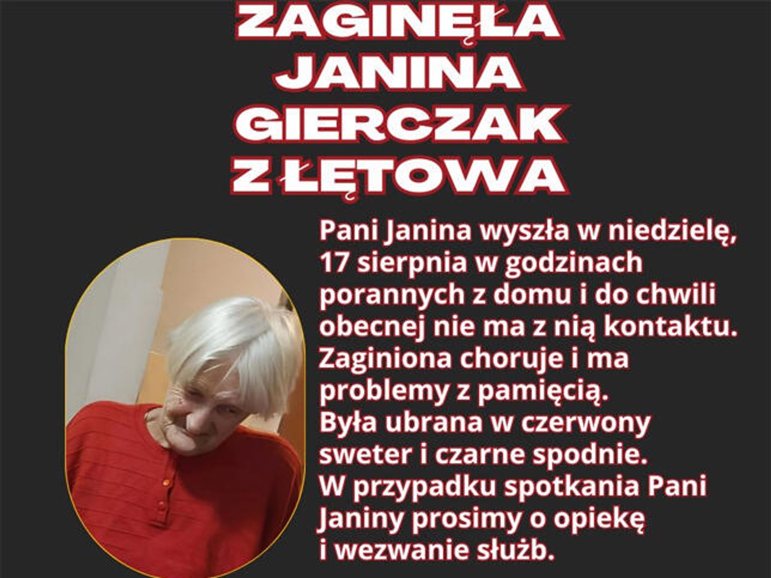 Pani Janina Gierczak jest mieszkanką Łętowa, ubrana była w czerwony sweter i czarne spodnie. Ma również problemy z pamięcią, dlatego w przypadku spotkania zaginionej prosimy o opiekę i wezwanie służb.