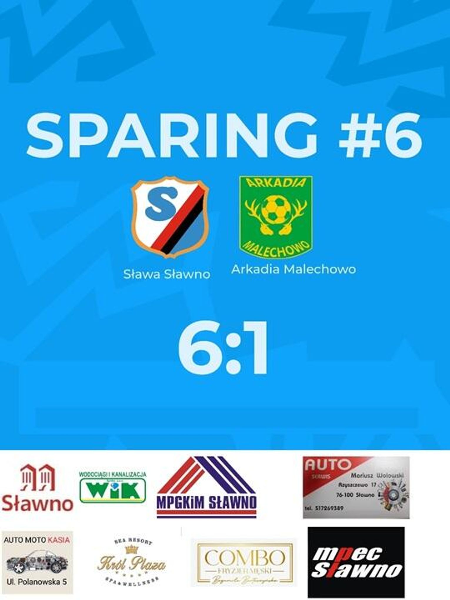 W ostatnim meczu kontrolnym rozegranym przeciwko Arkadii Malechowo, który odbył się 19 sierpnia o godz. 19:00, Miejski Klub Sportowy Sława Sławno odniósł bezapelacyjne zwycięstwo. Podczas meczu zdobyli aż 6 goli, swojemu przeciwnikowi pozwalając na tylko jeden skuteczny strzał (6:1). Ze Sławna bramki zdobyli kolejno: Iulian Bricicaru (dwa razy pod rząd), Błażej Banasik w ramach rzutu karnego, Rafał Wilga, ponownie Błażej Banasik oraz Marcin Kwiatkowski.