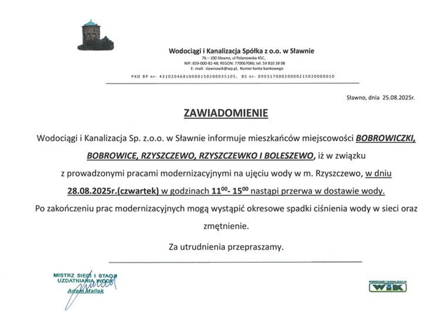 Jak informuje Spółka Wodociągi i Kanalizacja ze Sławna, w najbliższy czwartek (28.08.) należy się spodziewać przerwy w dostawie wody, która obejmie Bobrowiczki, Bobrowice, Rzyszczewo, Rzyszczewko oraz Boleszewo. Potrwa ona od godz. 11:00 do 15:00, choć w późniejszym czasie mogą też nastąpić okresowe spadki ciśnienia oraz zmętnienie wody. Powodem przerwy mają być prace modernizacyjne ujęcia wody w Rzyszczewie.