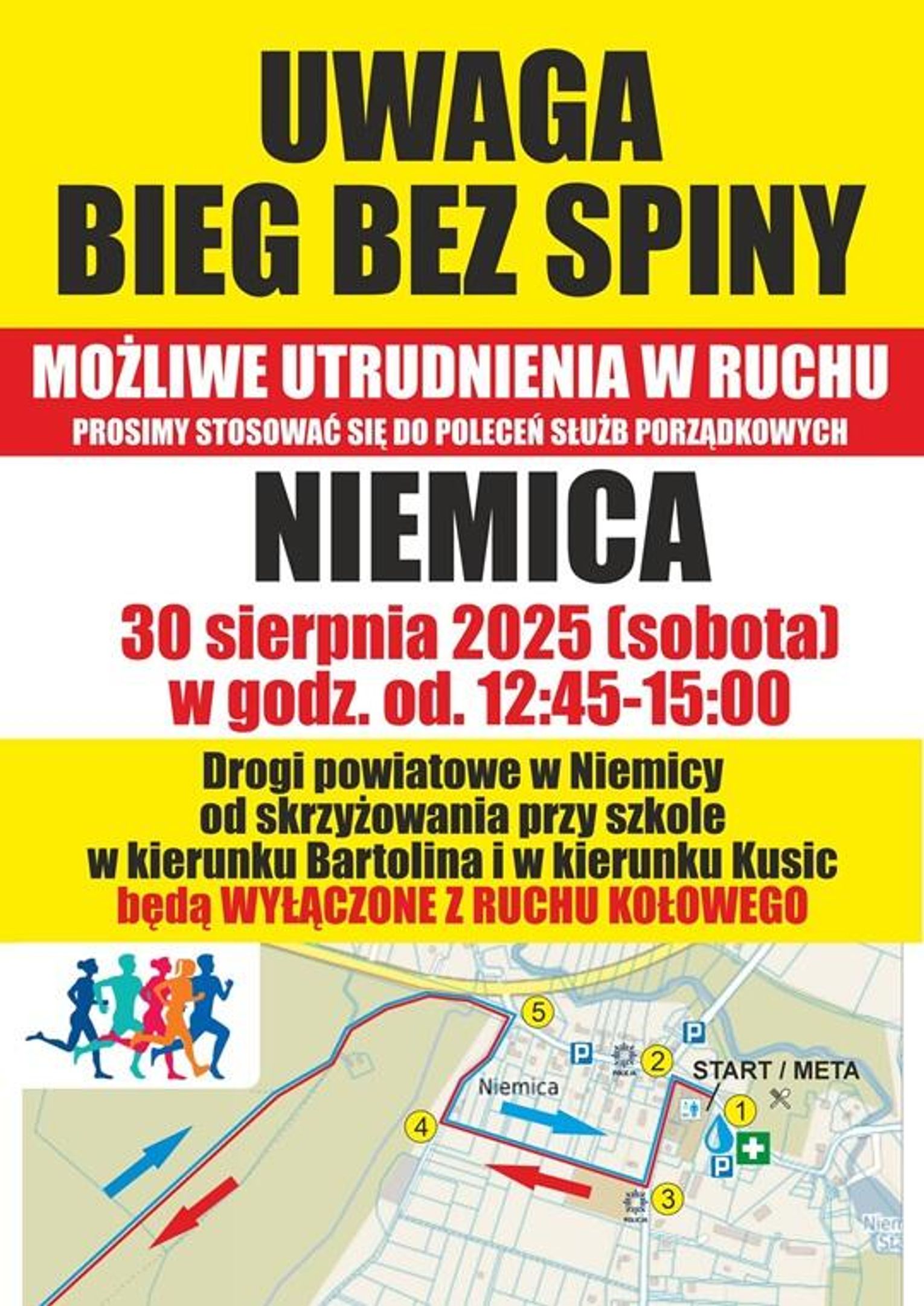 W najbliższą sobotę (30.08.) należy spodziewać się utrudnień w ruchu drogowym w Niemicy. Ze względu na organizację tego dnia VI Biegu Bez Spiny drogi powiatowe na odcinku od skrzyżowania przy Szkole Podstawowej w kierunku stacji benzynowej oraz w kierunku Kusice będą wyłączone z ruchu samochodowego między 12:45 a 15:00. Może to spowodować dodatkowe utrudnienia na trasie, a aby go ułatwić, należy słuchać poleceń służb porządkowych.