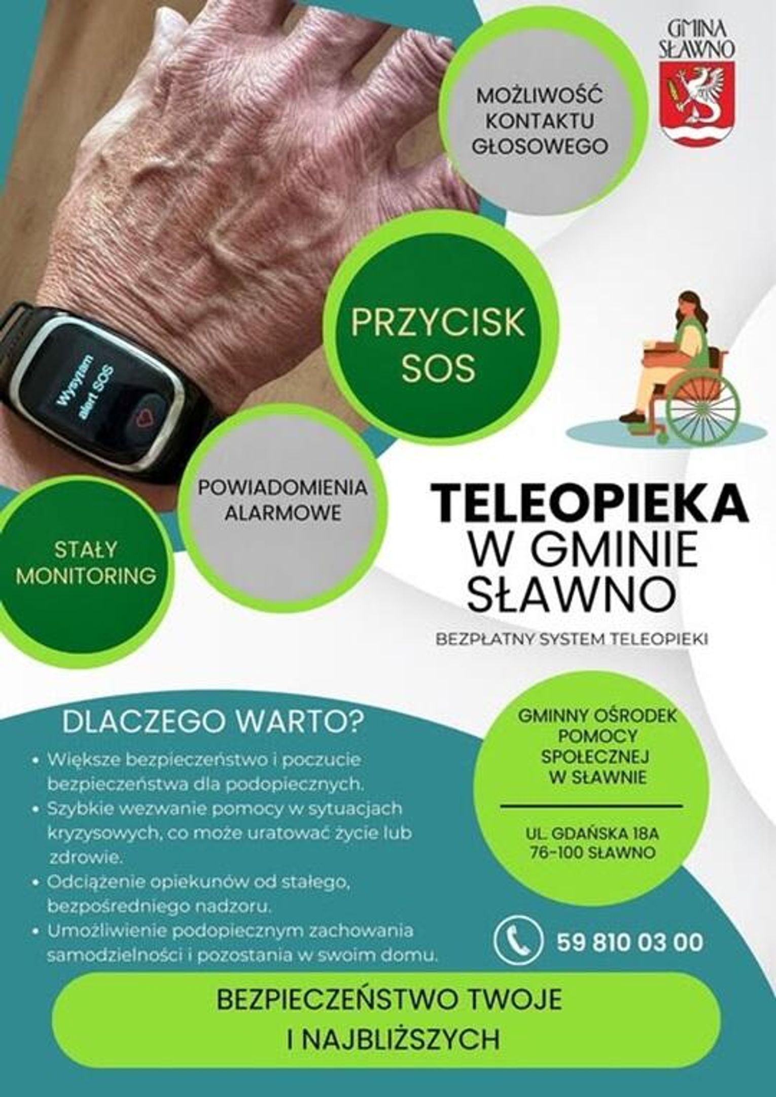 Mieszkańcy Gminy Sławno znajdujący się w szczególnej potrzebie mają szansę skorzystać z usługi teleopieki. Wsparcie polega na uzyskaniu w Gminnym Ośrodku Pomocy Społecznej w Sławnie specjalistycznej opaski. Na miejscu pracownicy będą kierować w sprawie załatwienia dalszych formalności oraz udzielą wszelkich informacji.