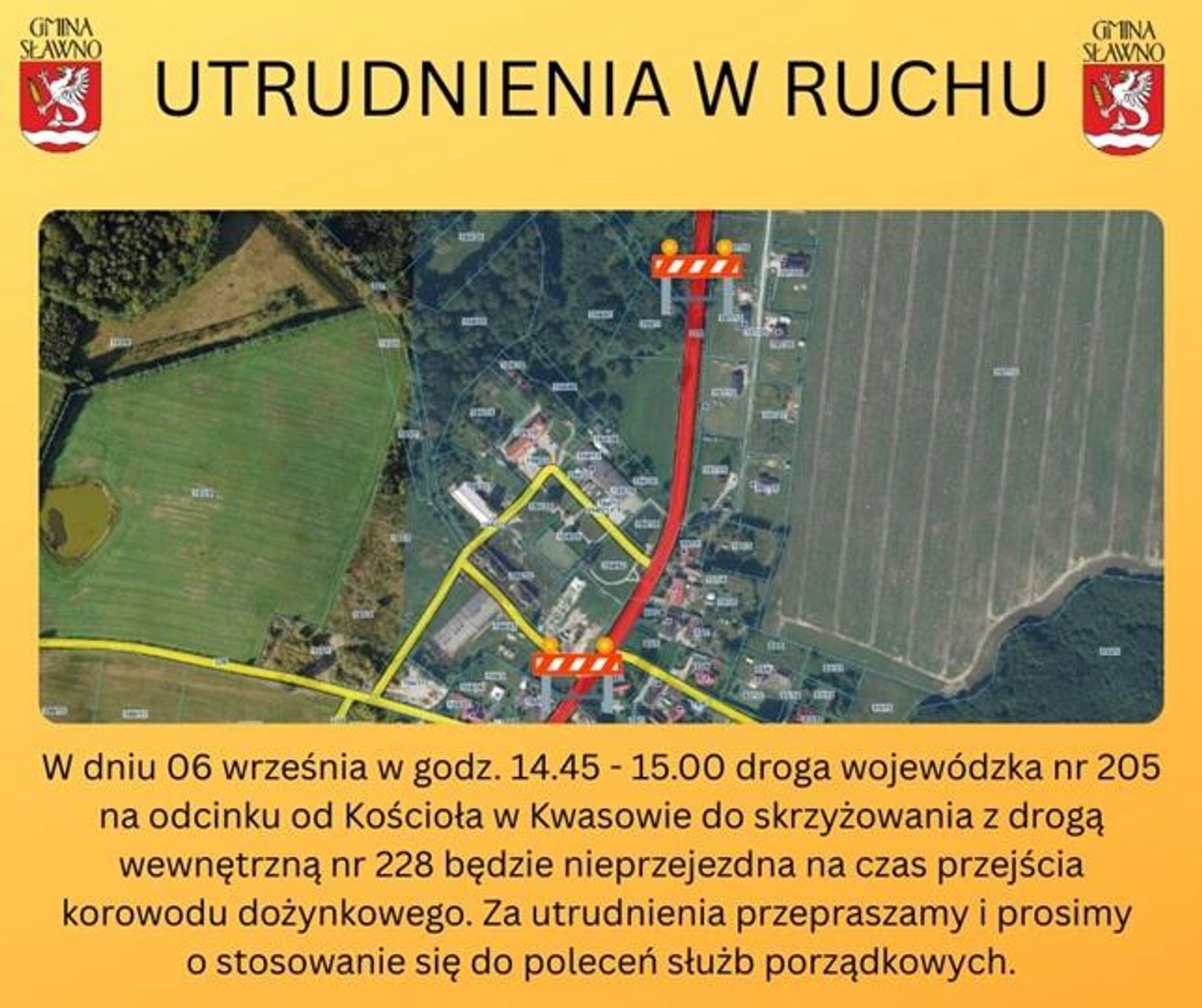 Ważna informacja dla kierowców poruszających się po Gminie Sławno - podczas Dożynek Gminnych w Kwasowie zamknięta zostanie droga wojewódzka.