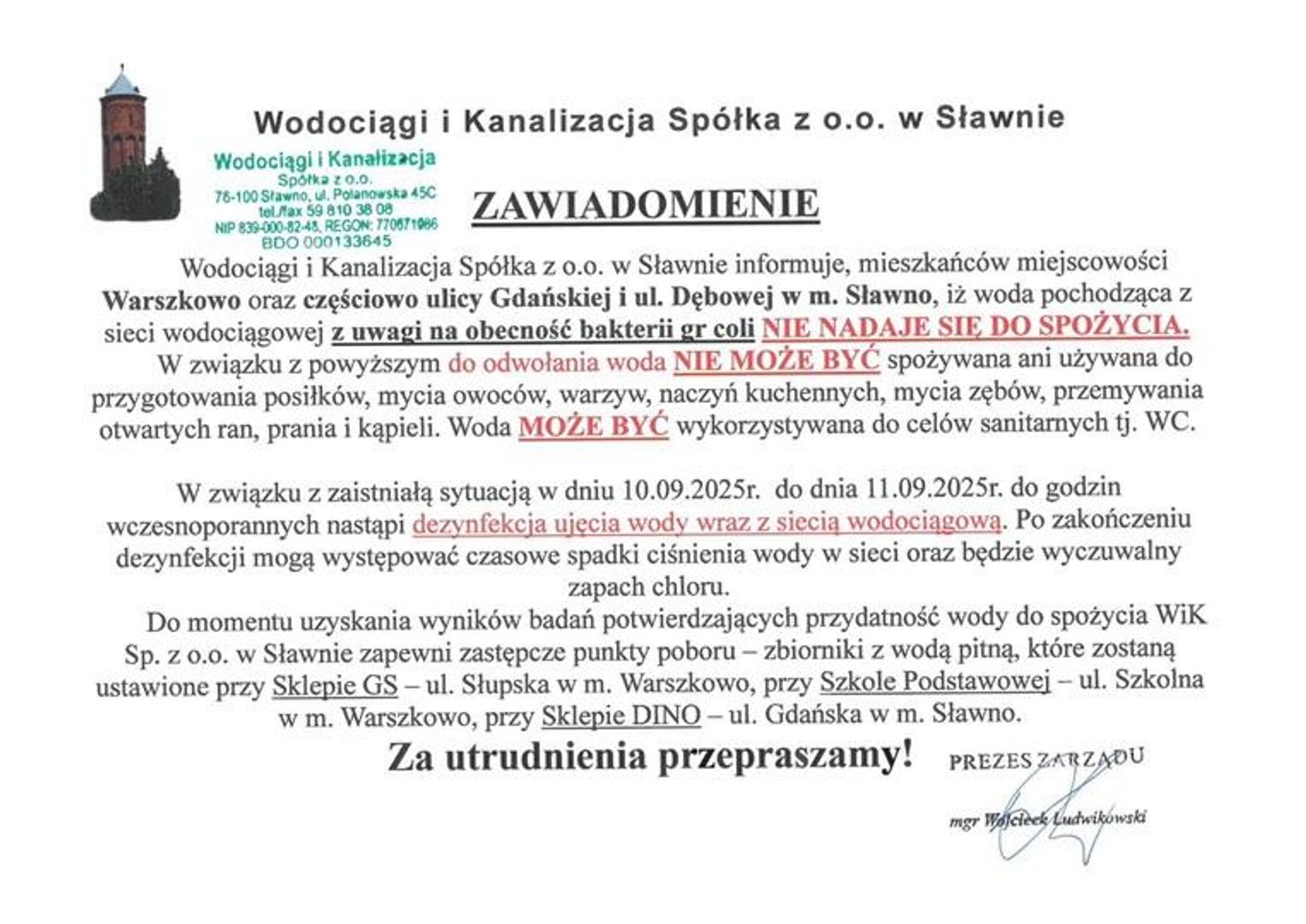 Powyższe instrukcje skierowane są do mieszkańców wsi Warszkowo oraz miasta Sławno zamieszkałych częściowo na ulicy Gdańskiej i Dębowej - aż do odwołania.