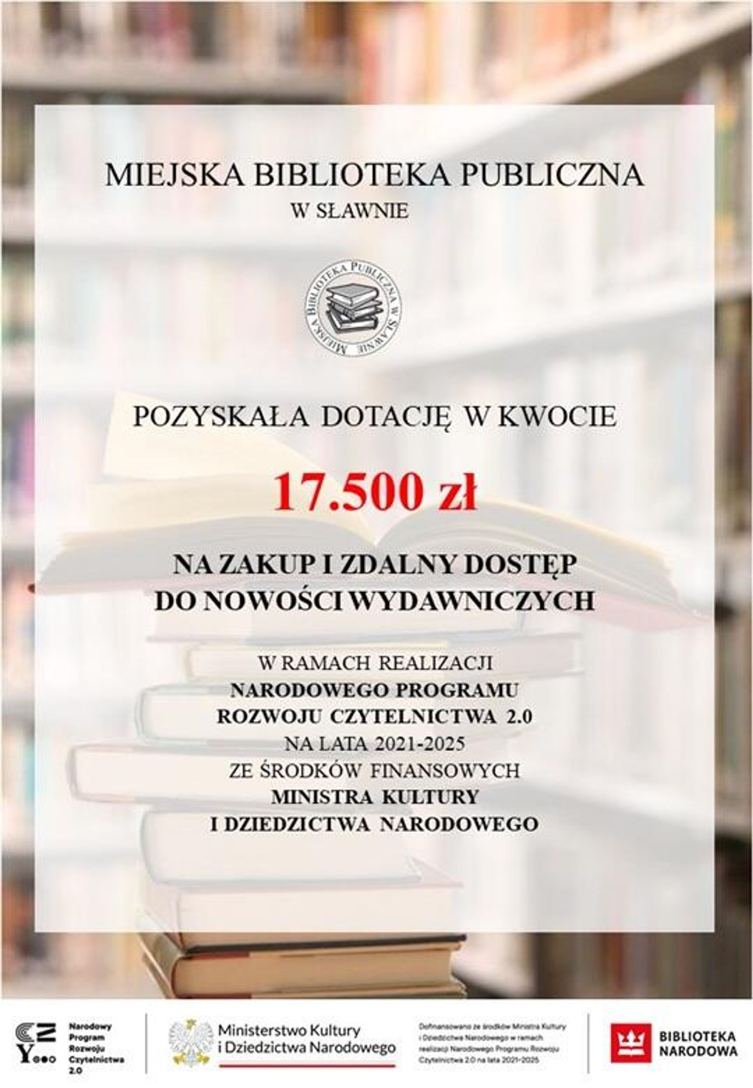 Kapitalne wieści płyną z Miejskiej Biblioteki Publicznej w Sławnie. Placówka może się pochwalić otrzymaniem dofinansowania w wysokości 17 500 zł na zakup nowości wydawniczych oraz zapewnienie zdalnego dostępu do książek. Dotacja była możliwa w ramach zadania „Dofinansowania dla bibliotek publicznych na zakup nowości wydawniczych oraz usług i zdalnego dostępu do książek w formatach e-booków i/lub audiobooków i/lub synchrobooków – Priorytet 1, Kierunek interwencji 1.1. w ramach NPRCz 2.0” z Narodowego Programu Czytelnictwa 2.0 na lata 2021-2025 ze środków finansowych Ministra Kultury i Dziedzictwa Narodowego. Dla czytelników oznacza to większy wybór w zasobie bibliotecznym, zupełnie nowe tytuły na regałach jak i lepszy dostęp do literatur - także w formie cyfrowej.