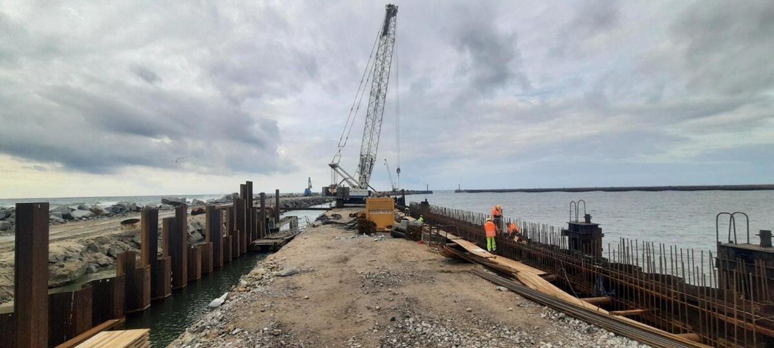 Na falochronie w Darłowie trwają dalsze prace w ramach projektu „Przebudowa falochronu w porcie Darłowo wraz z poprawą warunków falowania wewnątrz basenu poprzez budowę nowych obiektów hydrotechnicznych”. Obecne działania obejmują m.in. skuwanie parapetu istniejącego falochronu, pogrążanie ścianki szczelnej od strony morskiej i ścianki stalowej od strony portu, układanie geowłókniny oraz wykonywany jest zasyp kamienny.