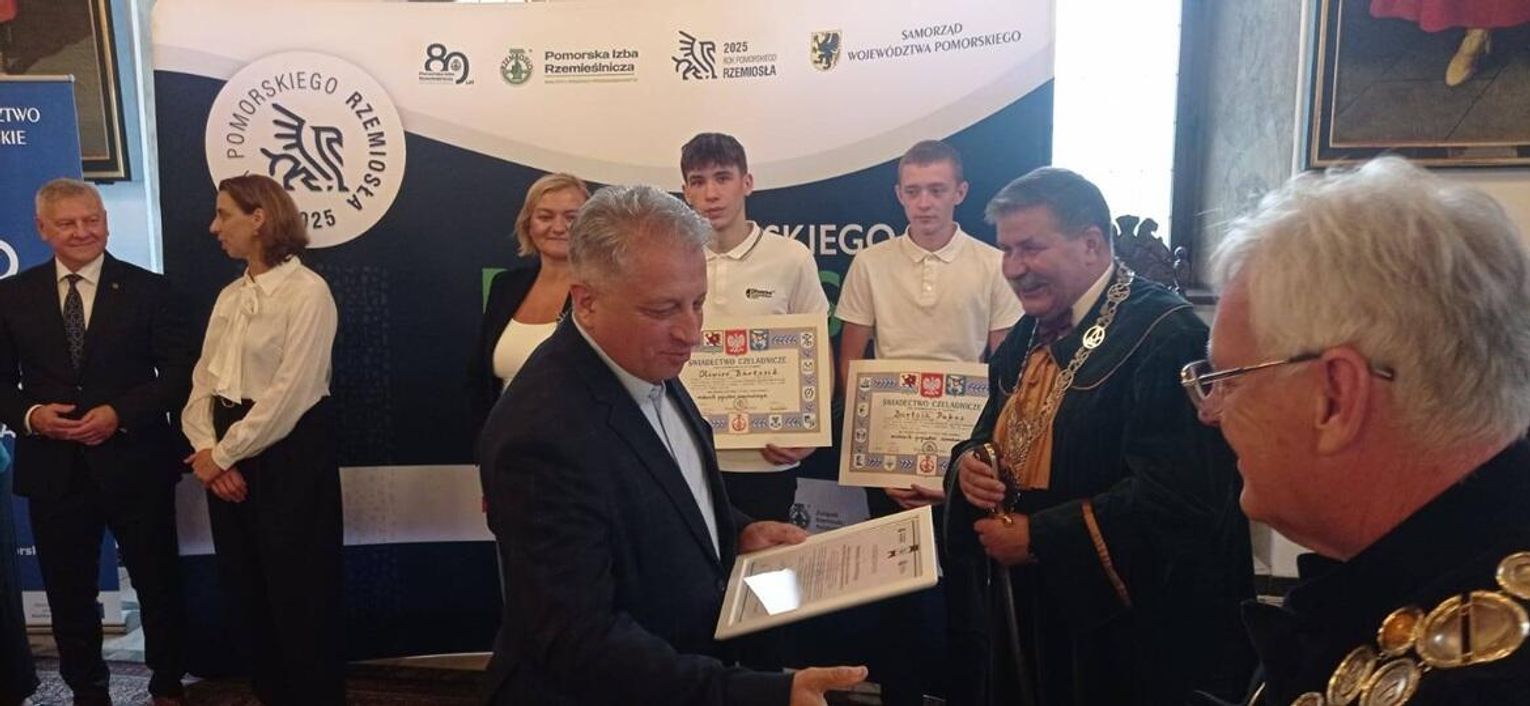 Oliwier i Bartosz znaleźli się w gronie trzydziestu młodych czeladników, którzy uzyskali najwyższe wyniki z egzaminu czeladniczego i zostali pasowani na czeladników Szablą Kilińskiego przez prezesów obu izb.