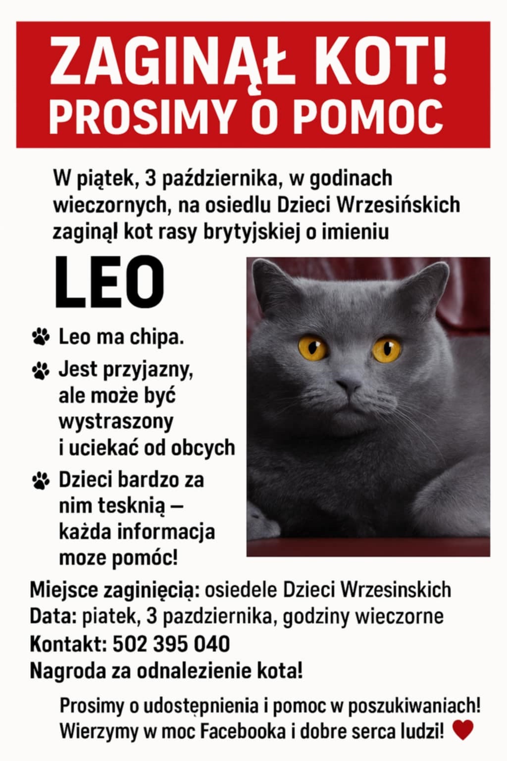 Zaginął kot — właściciele proszą o pomoc i oferują nagrodę. Pupil zniknął w ostatnich dniach; proszą o kontakt każdego, kto widział go w okolicy lub ma informacje umożliwiające jego odnalezienie.