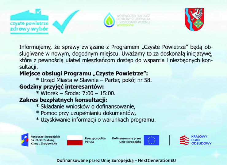Informujemy, że sprawy związane z Programem "Czyste Powietrze" można załatwiać teraz w Urzędzie Miasta Sławna w pokoju nr 58, który znajduje się na parterze budynku.