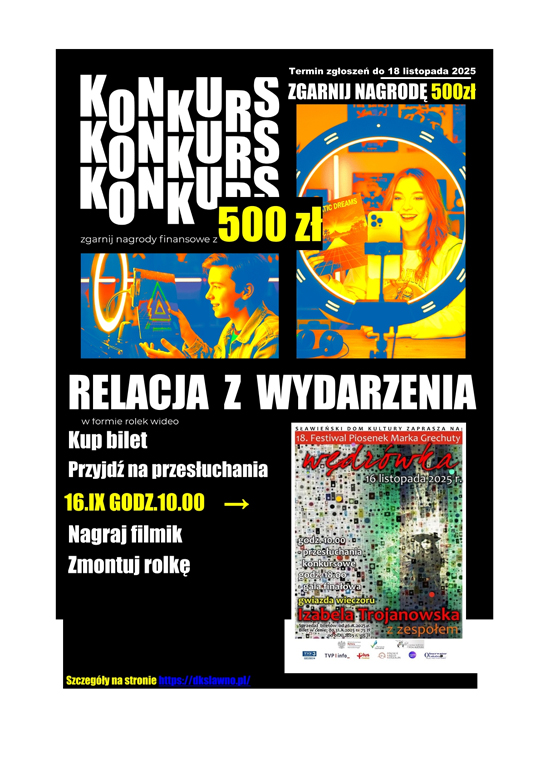 W ramach tego wydarzenia zapraszamy uczniów szkół podstawowych i ponadpodstawowych Powiatu Sławieńskiego do udziału w konkursie na najlepszy artykuł, recenzję lub felieton (gatunek to wasz wybór) poświęcony przesłuchaniom konkursowym, które rozpoczną się 16 listopada 2025 r. o godz. 10:00.