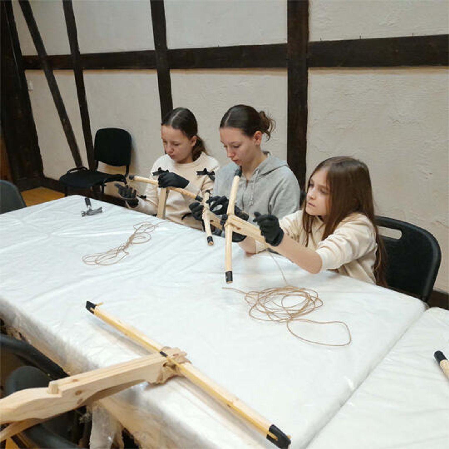 Następnie, niczym dawni rzemieślnicy, samodzielnie wykonały własne kusze i bełty, by na zakończenie sprawdzić je w bezpiecznym mini turnieju. Było dużo skupienia, świetnej zabawy i pierwszych kuszniczych sukcesów – a to dopiero początek zamkowych przygód!