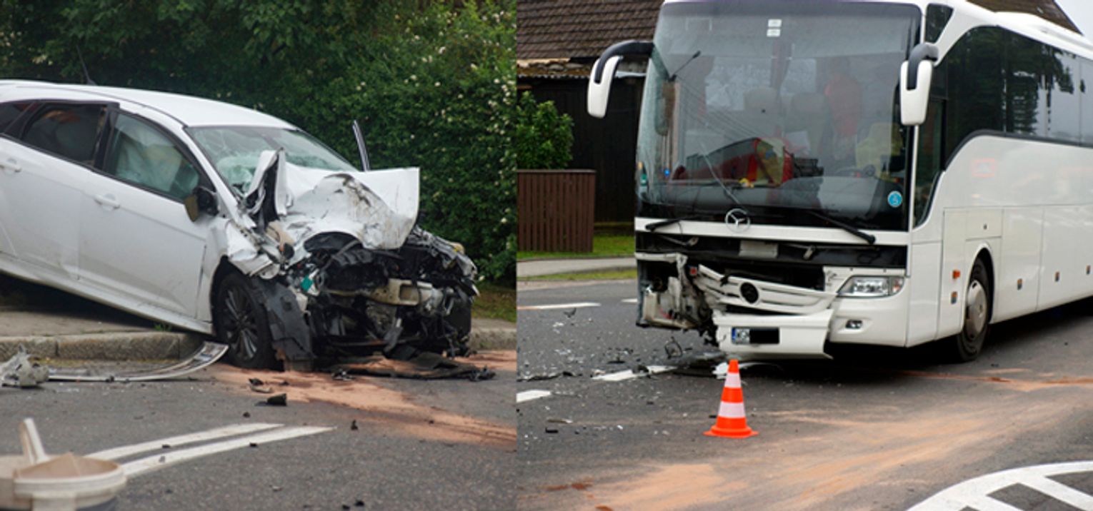 Czołowe zderzenie zniszczyło przód Forda i uszkodziło autobus.