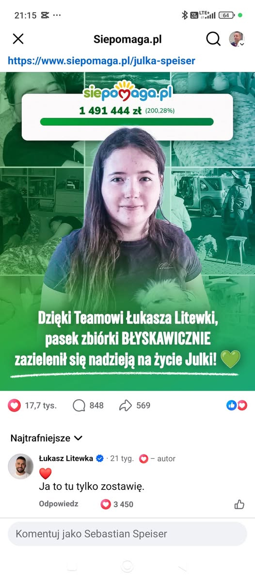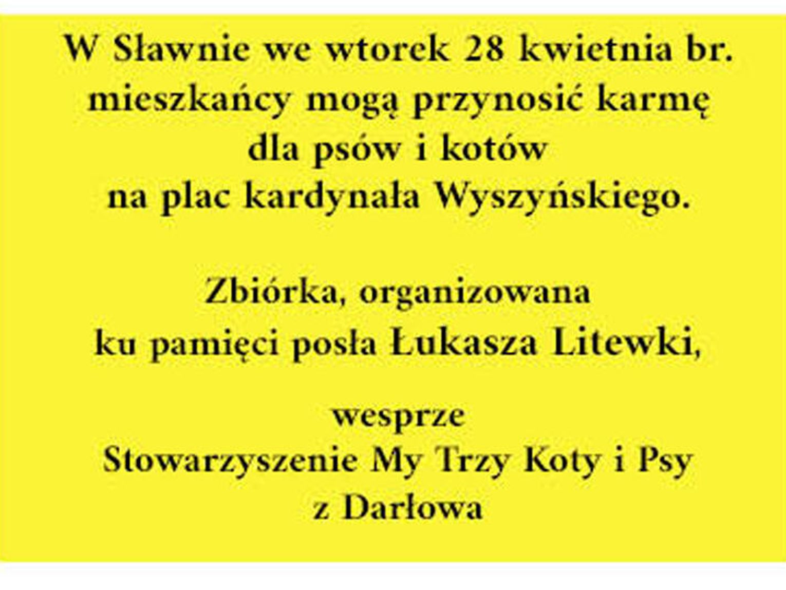– Chcemy uczcić pamięć o pośle Łukaszu Litewce znanym z wielkiego serca dla zwierząt. On także pomógł mojej rodzinie. Wspólnie ze Stanisławem Motykowskim organizujemy zbiórkę karmy dla psów i kotów. Zebraną żywność przekażemy Stowarzyszeniu My Trzy Koty i Psy z Darłowa. Zapraszam do włączenia się w tę spontaniczną akcję – przekazał Sebastian Speiser ze Sławna.