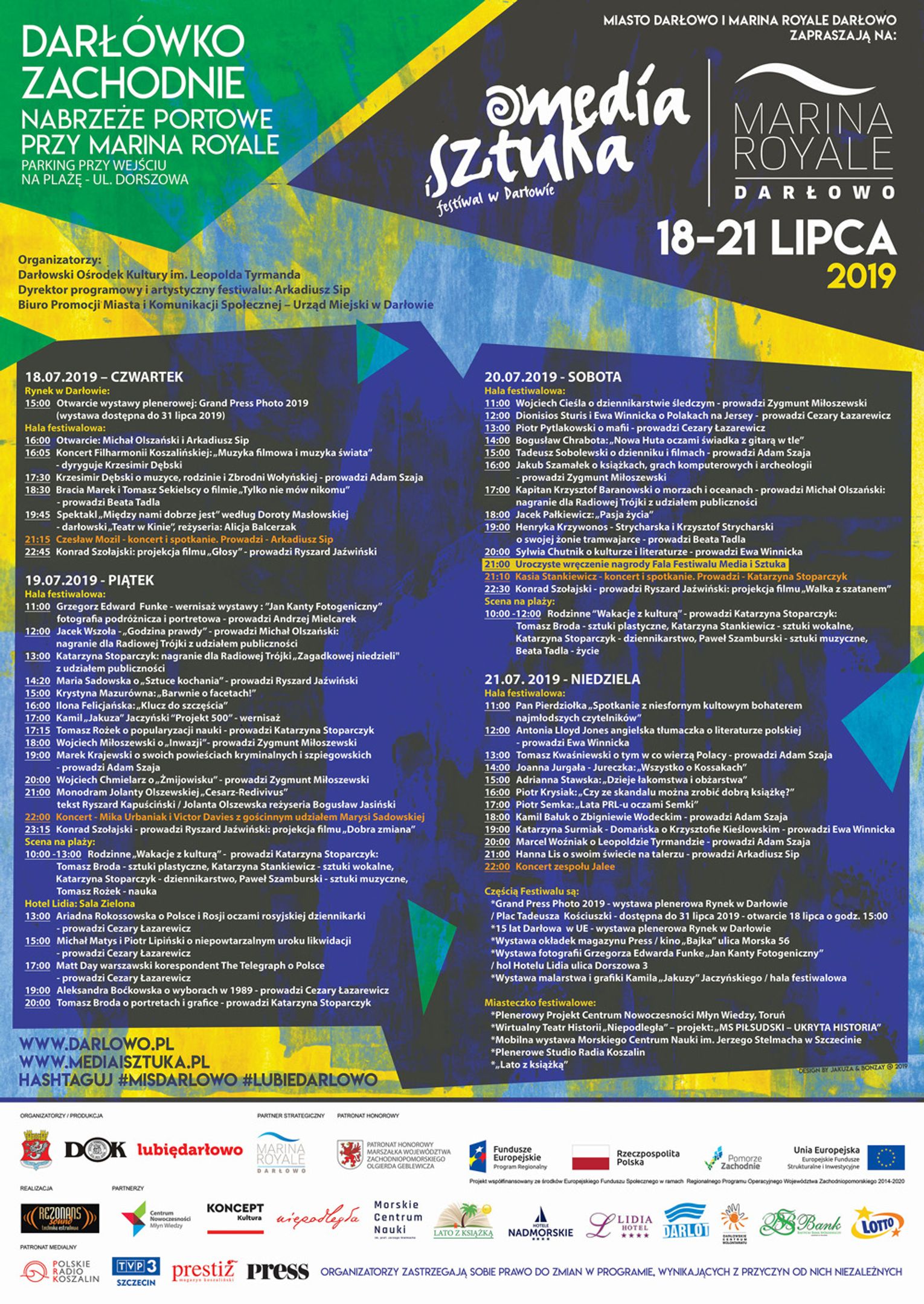 Projekt współfinansowany ze środków Europejskiego Funduszu Społecznego w ramach Regionalnego Programu Operacyjnego Województwa Zachodniopomorskiego 2014-2020 PATRONAT HONOROWY MARSZAŁKA WOJEWÓDZTWA ZACHODNIOPOMORSKIEGO OLGIERDA GEBLEWICZA Organizatorzy: Darłowski Ośrodek Kultury im. Leopolda Tyrmanda Biuro Promocji Miasta i Komunikacji Społecznej – Urząd Miejski w Darłowie Dyrektor programowy i artystyczny festiwalu: Arkadiusz Sip