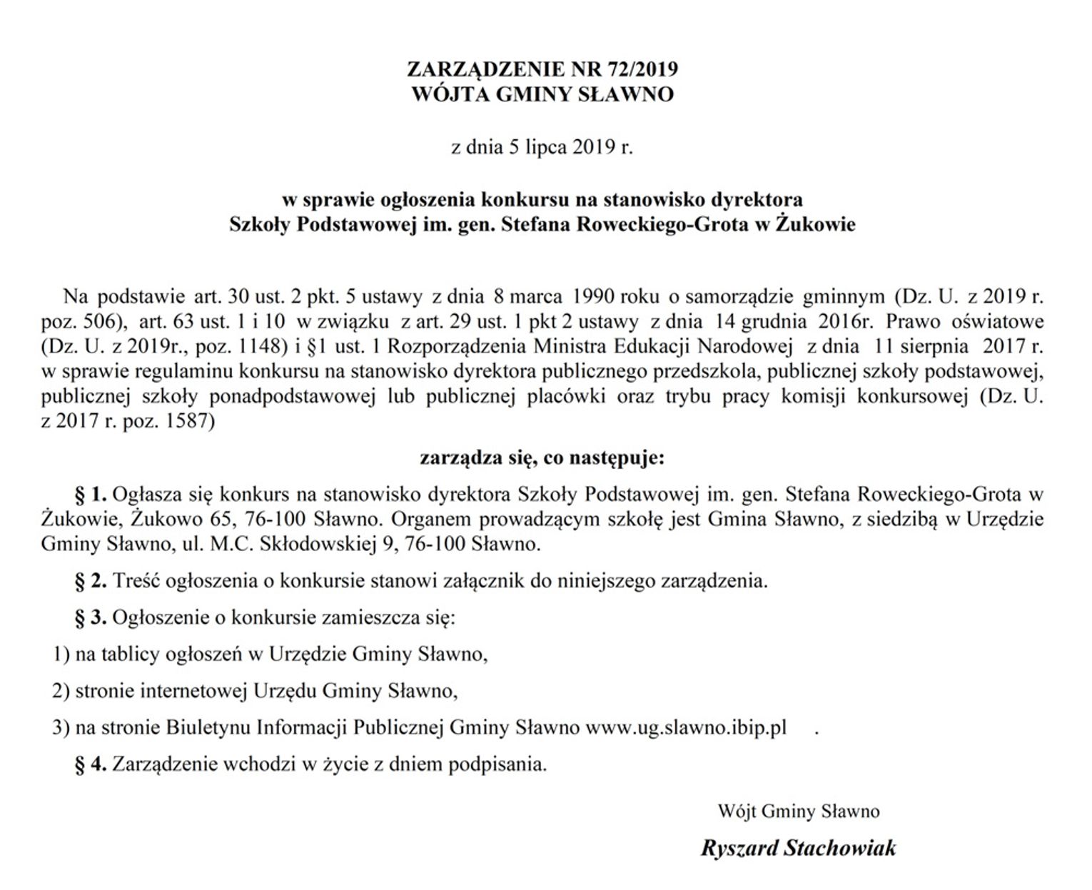 W miniony piątek (05.07.2019 r.) Ryszard Stachowiak - wójt gminy Sławno ogłosił konkurs na stanowisko dyrektora Szkoły Podstawowej im. gen. Stefana Roweckiego-Grota w Żukowie. O tym, jakie trzeba spełnić warunki, aby przystąpić do konkursu na dyrektora SP, można przeczytać na stronie internetowej Urzędu Gminy Sławno, lub klikając >TUTAJ<