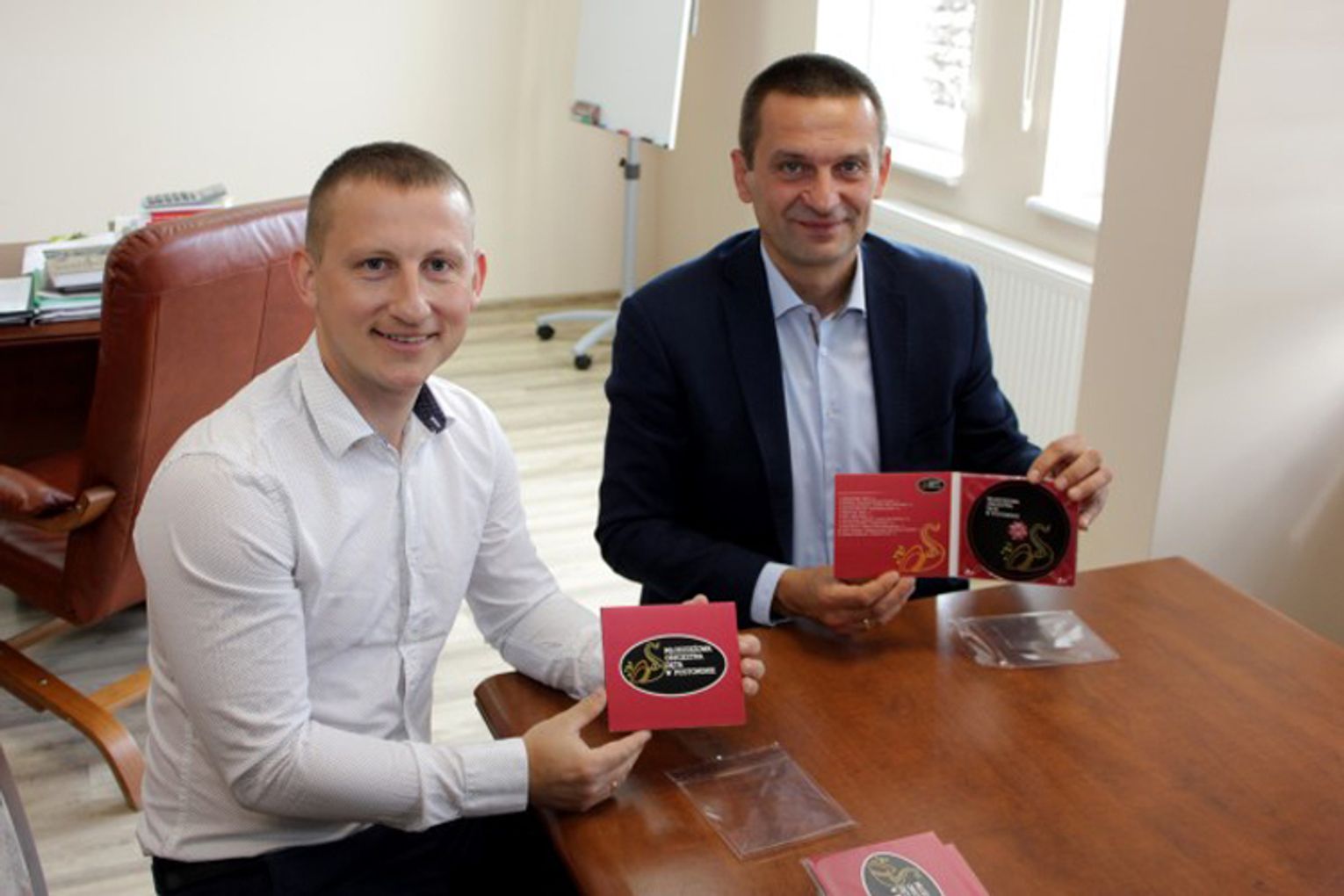 Janusz Bojkowski - wójt gminy Postomino oficjalnie przekazał kapelmistrzowi Młodzieżowej Orkiestry Dętej z Postomina – Marcinowi Rąpalskiemu płytę, która została wydana z okazji jubileuszu 15-tych urodzin orkiestry.