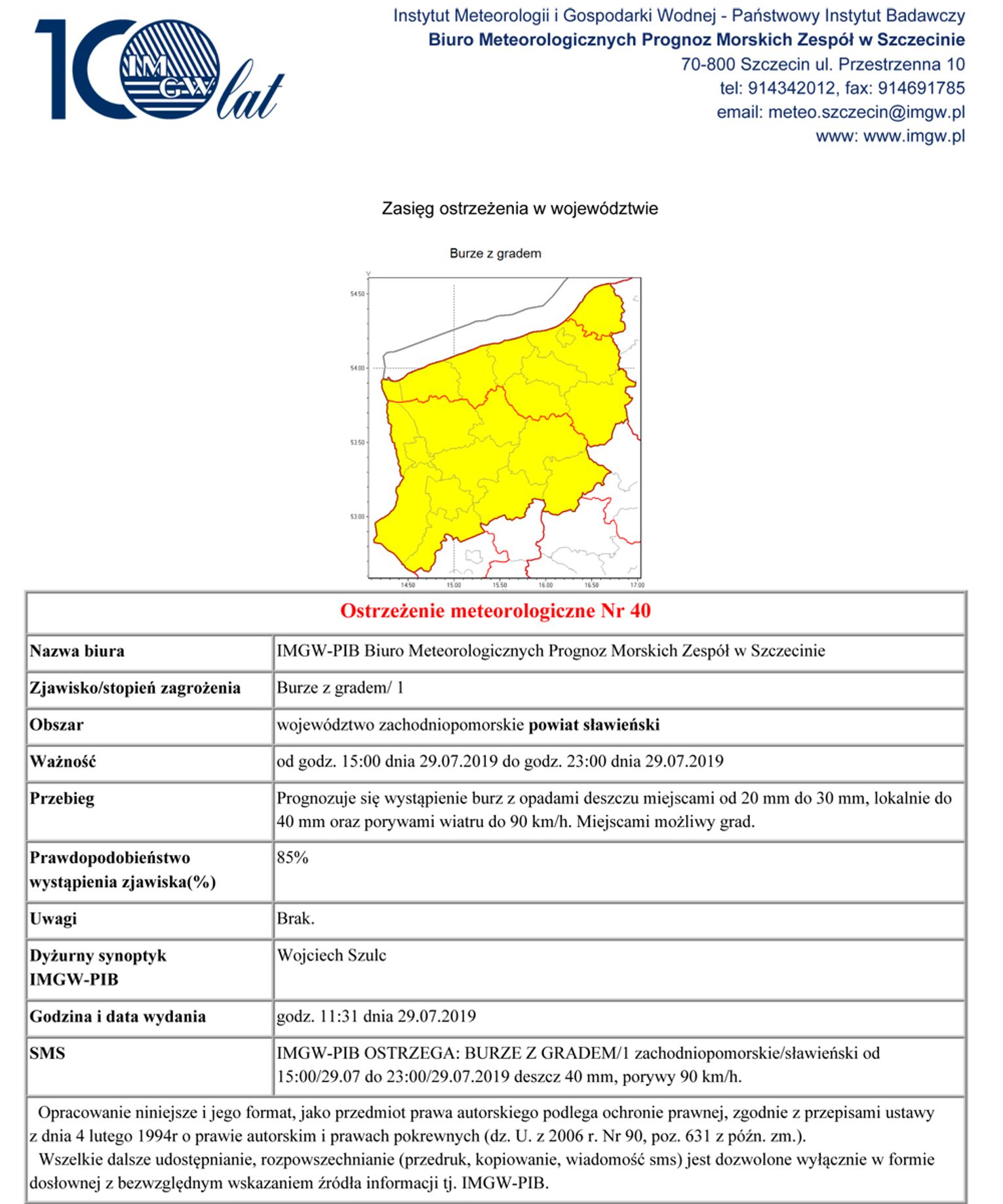 Dziś (29.07) od godziny 15:00 przewiduje się burze z deszczem i gradem.