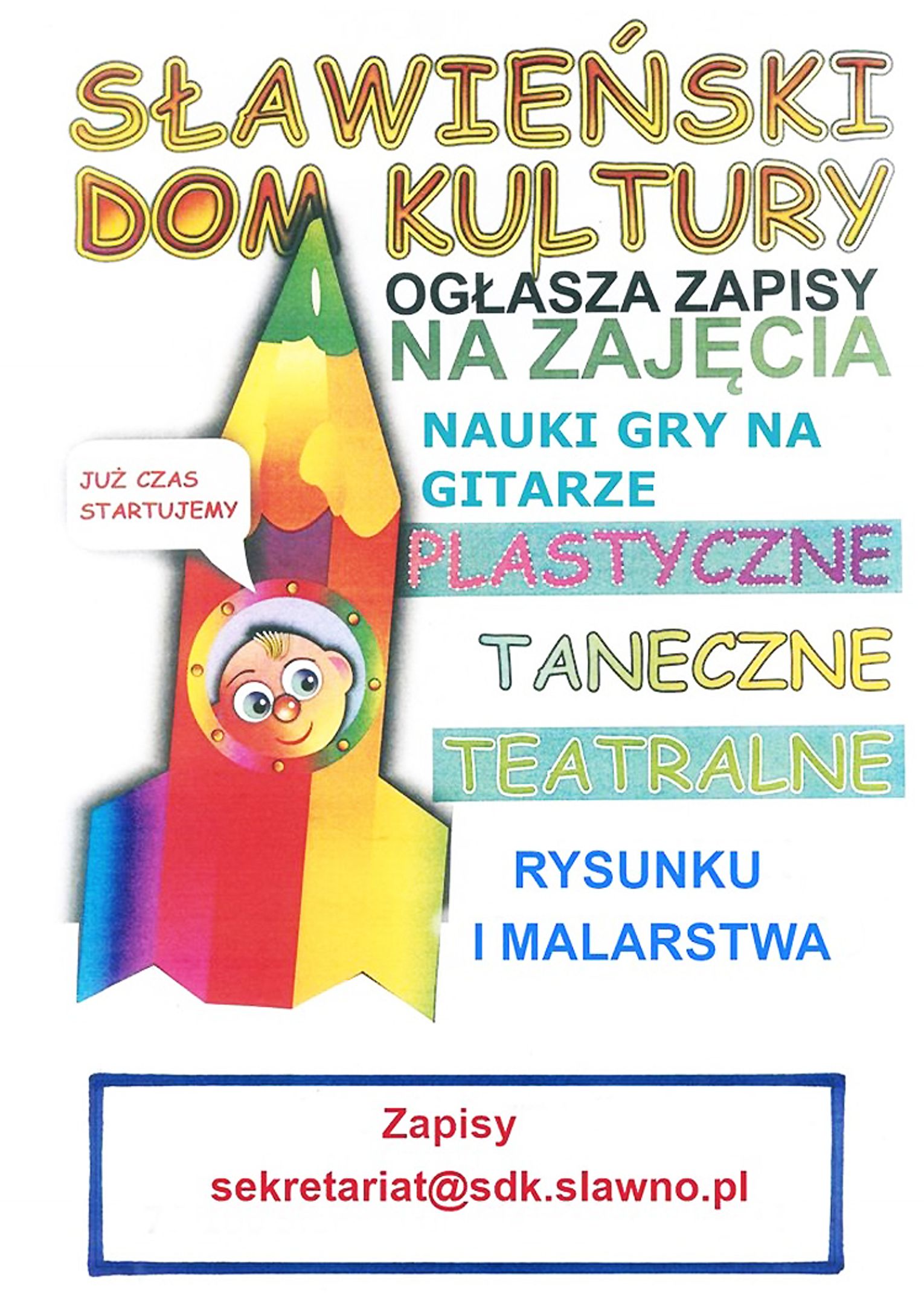 Gdy znudzi Cię telewizja, gdy w Internecie nie ma odpowiedzi na Twoje pytania, a radio za mocno trzeszczy to znak, że coś się dzieje. Na jesienną chandrę, zimową depresję, czy wiosenną radość odpowiedź jest tylko jedna... zajęcia artystyczne w Sławieńskim Domu Kultury. Już we wrześniu startujemy z breakdance’em oraz sekcją baletową, a od października zapraszamy chętnych do grup plastycznych, teatralnych, rysunku i malarstwa oraz nauki gry na gitarze.Zapisy przyjmowane są pod adresem e-mail: [email protected] lub telefonicznie: 59 810 76 70; 793 967 670.