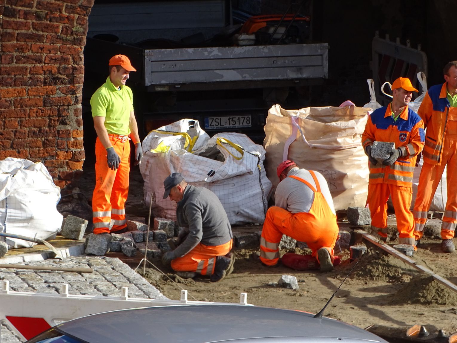 Trwają ostatnie prace na ulicy Basztowej w Sławnie, prowadzone przez Przedsiębiorstwo Drogowe "DROBET". Pogoda sprzyja, właśnie układana jest kostka brukowa.
