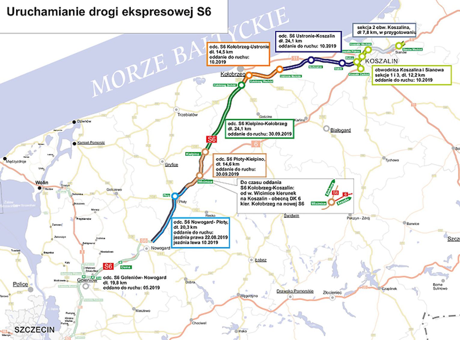 Na otwartych odcinkach pomiędzy Kiełpinem i Kołobrzegiem obowiązuje tymczasowa organizacja ruchu wskazująca dojazd nowym odcinkiem do Kołobrzegu. Kierowcy jadący do Koszalina i dalej Gdańska powinni na węźle Wicimice zjechać na dotychczasową DK6.