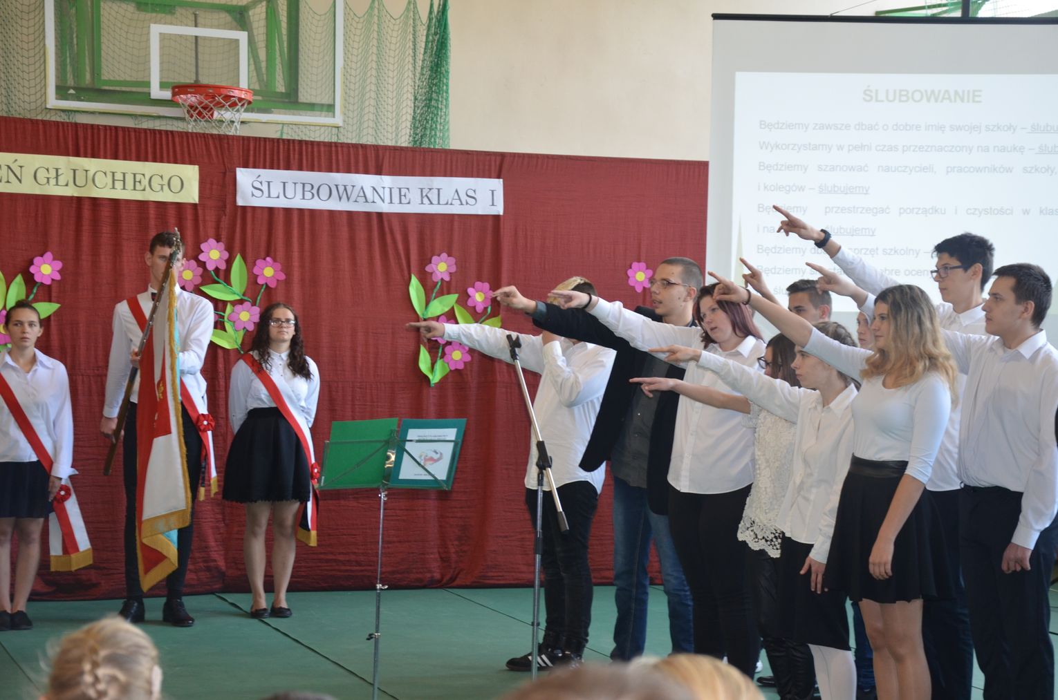 Uroczystość szkolną rozpoczęła dyrektor Agnieszka Hryckowian. Po przemówieniu uczniowie klas pierwszych przedstawili krótką historię Międzynarodowego Dnia Głuchego oraz przekazali informację na temat sytuacji osób niesłyszących w Polsce. Następnie uczniowie klas pierwszych złożyli uroczyste ślubowanie w obecności całej społeczności szkolnej. Po części oficjalnej nastąpiła część artystyczna, czyli „otrzęsiny”, którą przygotowali koledzy i koleżanki z klasy III TŻiUG oraz II i III BSI. Wszyscy bawili się doskonale!